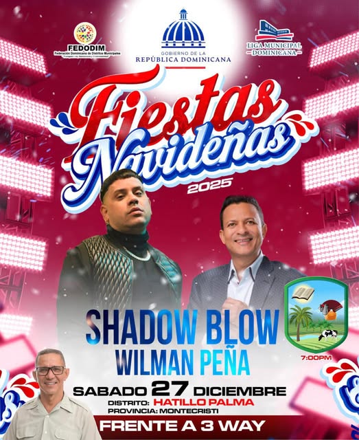 La gran cita artística será este sábado 27 de diciembre, a partir de las 7:00 PM, en el emblemático escenario ubicado frente a 3 Way. La noche promete ser inolvidable con una cartelera de lujo que incluye la música urbana de Shadow Blow y todo el sabor de nuestra tierra con el merengue típico de Wilman Peña. Este evento, totalmente gratuito, busca regalar un momento de esparcimiento de alta calidad a un pueblo que se caracteriza por su alegría y laboriosidad.